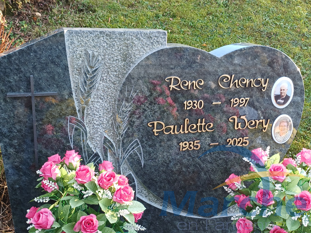 Tombe en granit avec bac à fleurs par devant la tombe et recouverte par une dalle de même nature.