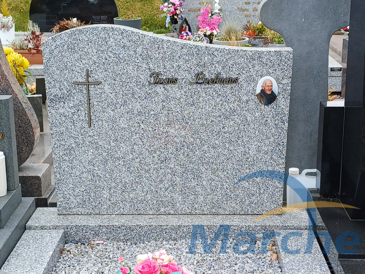 Parcelle entourée d'une bordure en granit. Stèle au fond. Gravier au sol.