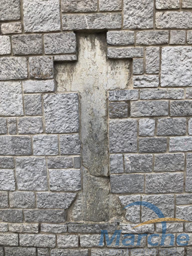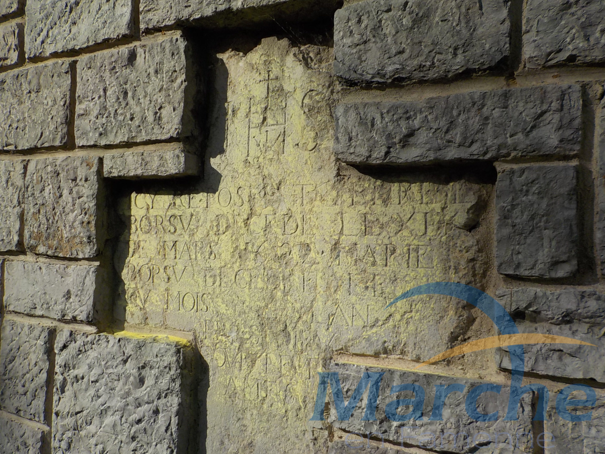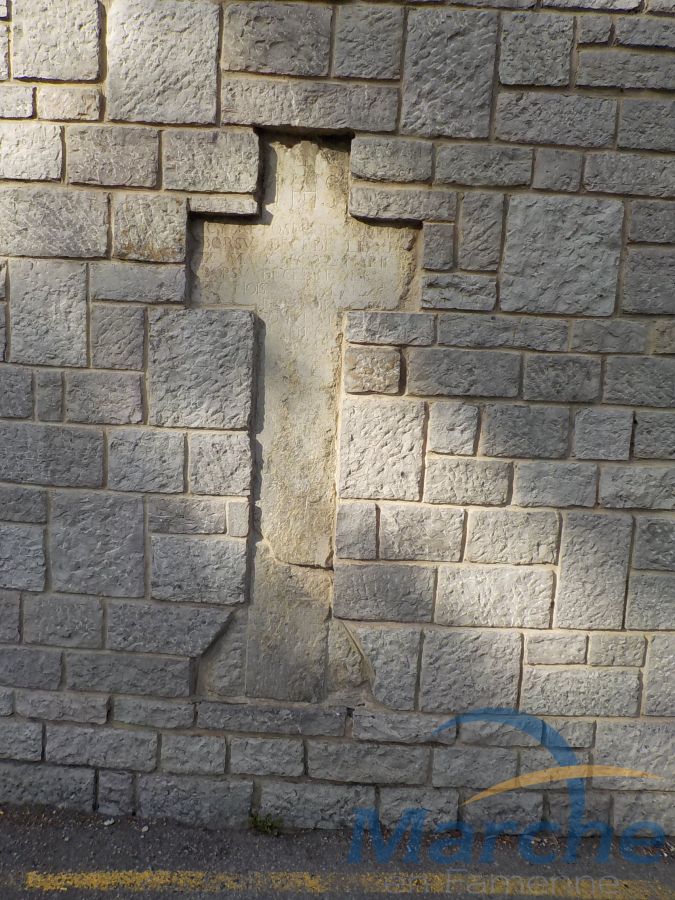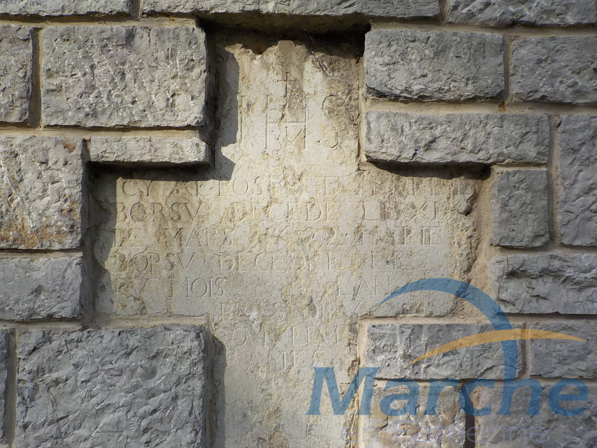 Ancienne croix tombale intégrée dans le mur extérieur de l'église.